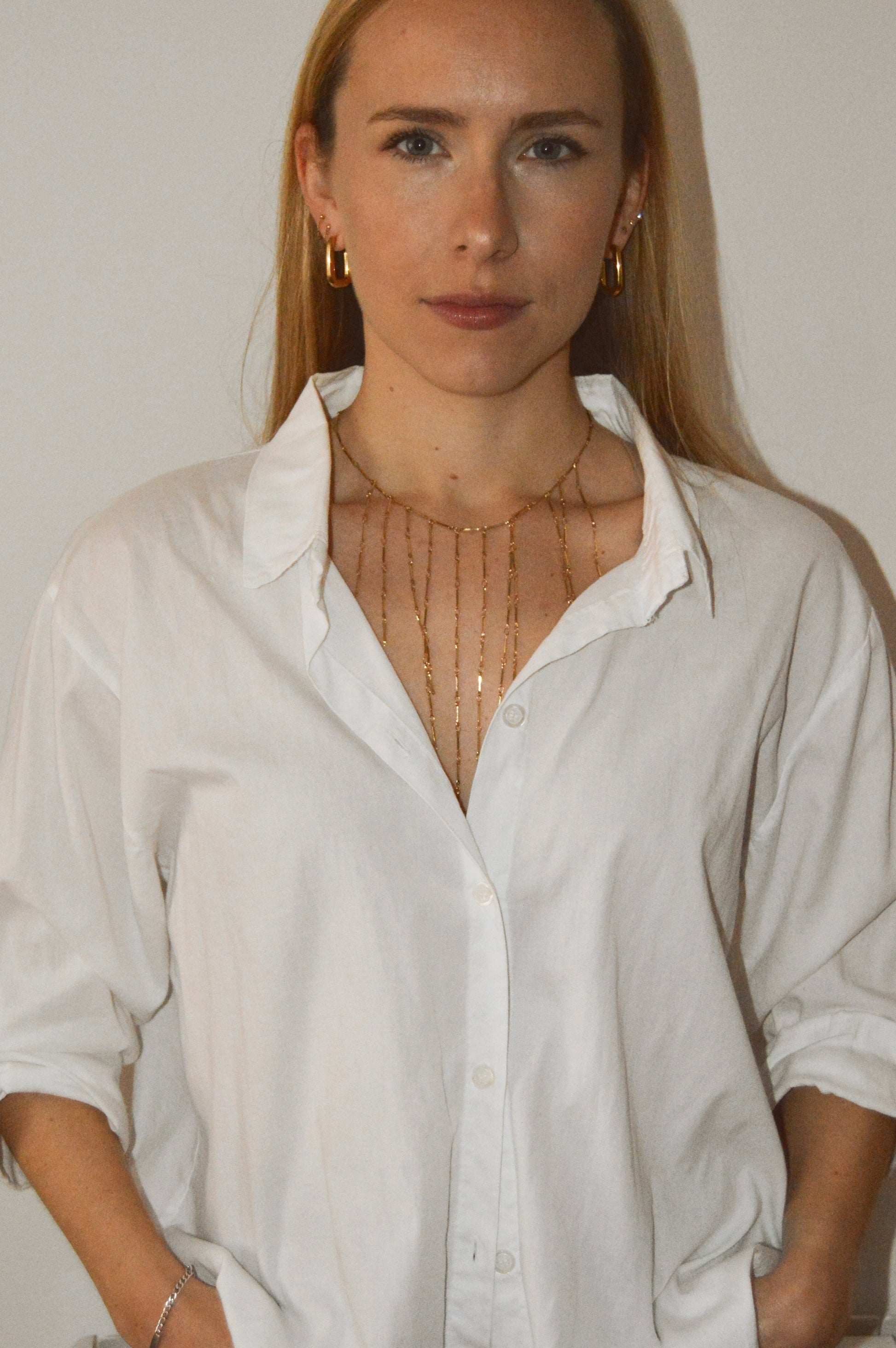 El Collar Rain Largo de Blooming Barcelona está diseñado para capturar la poesía de la lluvia: pequeñas gotas móviles que se deslizan con suavidad y reflejan la luz de forma mágica. Confeccionado en acero inoxidable, es resistente, duradero y apto para el día a día.